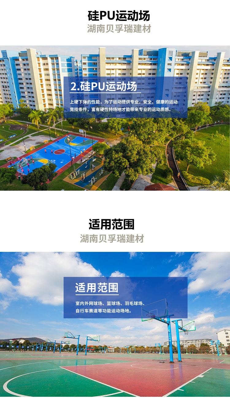 ②、超強的耐磨性:硅PU面層采用添加硅樹脂顆粒做法,其結(jié)構(gòu)特征恒久穩(wěn)定不變,軟硬適中,耐磨性能滿足長期高使用頻率的需要。